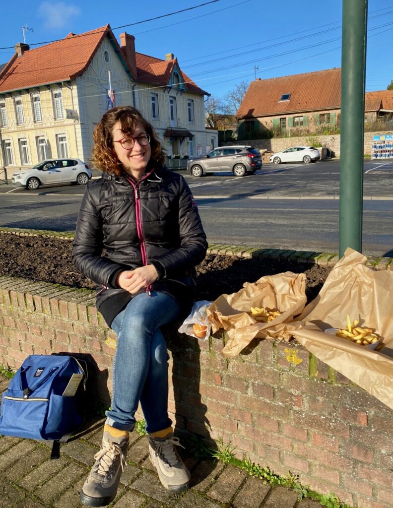 Il était midi lorsque nous sommes arrivées à Écourt, autant dire que ce marchand de frites tombait à pic… même si nous avions prévu sandwiches, eau et café dans notre sac à dos. Sachant que 10 longs kilomètres nous attendaient, nous avons cédé à la tentation sans aucun état d’âme. Avec même un petit muret pour notre pause repas.