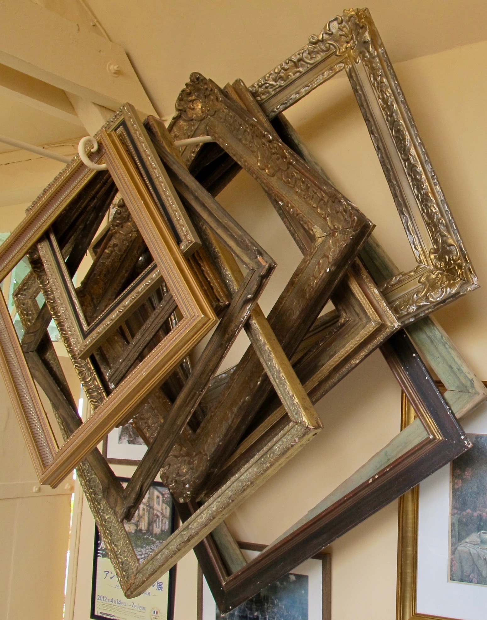 Cadres suspendus dans atelier peintre – Jardins Henri le Sidaner Gerberoy Oise