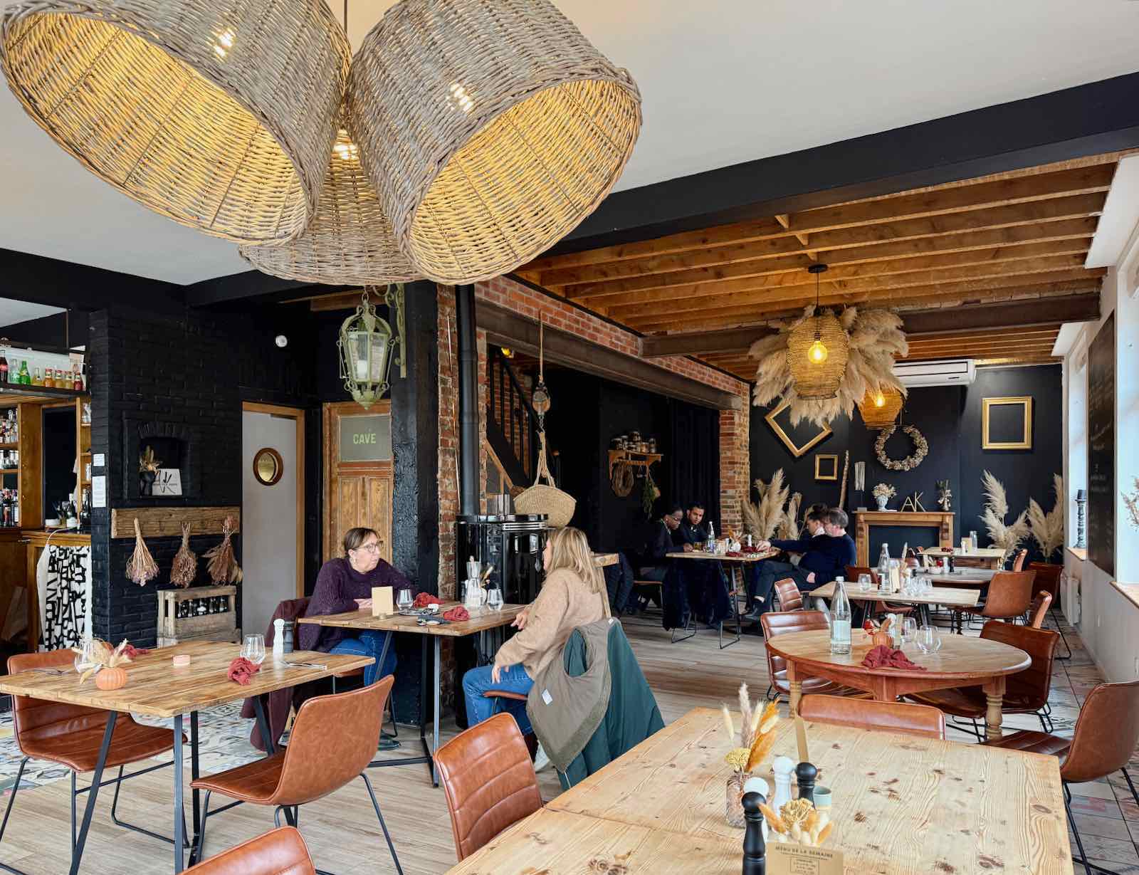 Du noir sur les murs, des objets vintage, des fleurs séchées, du rotin, une collection de dames Jeanne, des tables brutes, Kevin et Lucile ont créé un univers à eux Au Koning Van Peene et cela fonctionne très bien.