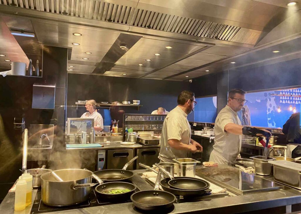 Ce qui est sympa aussi à L’Aloze, c’est qu’on peut assister à la préparation de son plat, derrière une baie vitrée, ouverte sur la salle. Si la cuisine de La Liégeoise est à l’étage, celle de L’Aloze se trouve au rez-de-chaussée, avec sa propre brigade.