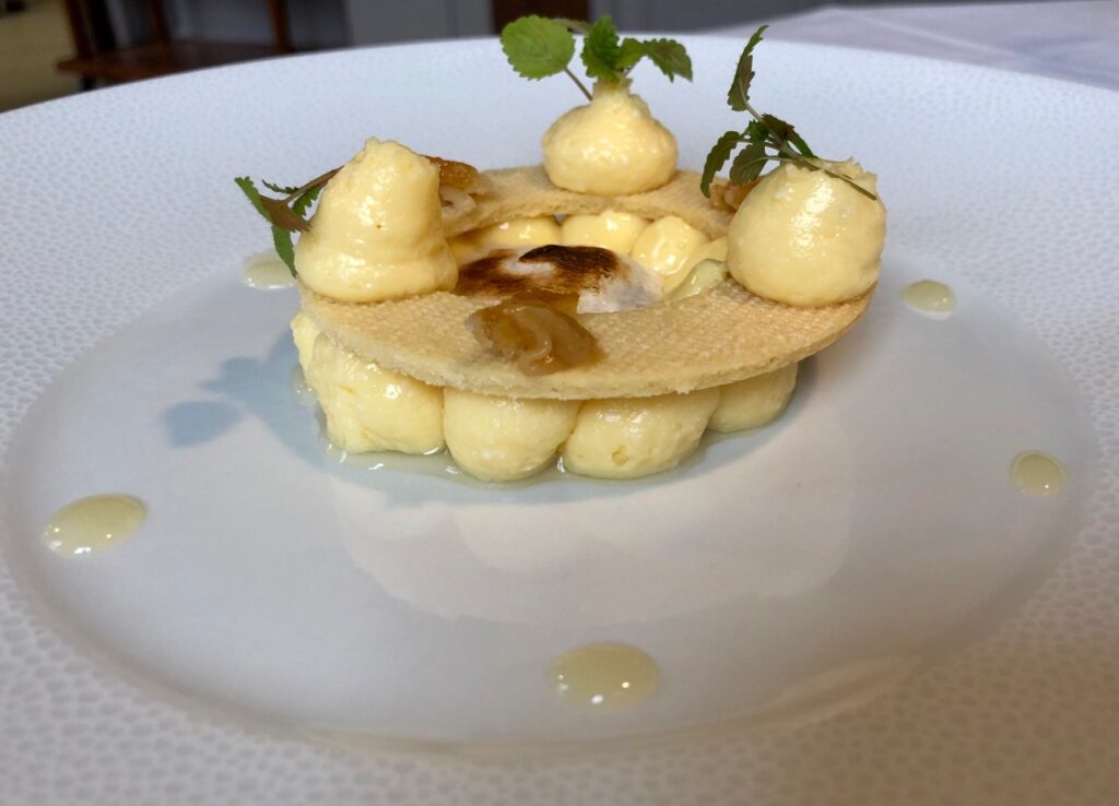 Après ces découvertes picardes, il fallait conserver une petite place pour le dessert. Heureusement que j’avais, au moment de la commande, opté pour celui au yuzu, cet agrume venu du Japon, de plus en plus en vogue sur les belles tables. À La Clé des champs, ce yuzu entrait dans la composition d’une crème légère, posée sur et sous une pâte sucrée mariée au citron confit. Le genre d’entremets fin et ultra léger, qui ne fait pas regretter d’avoir pris un dessert…