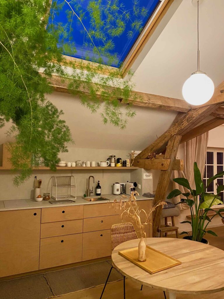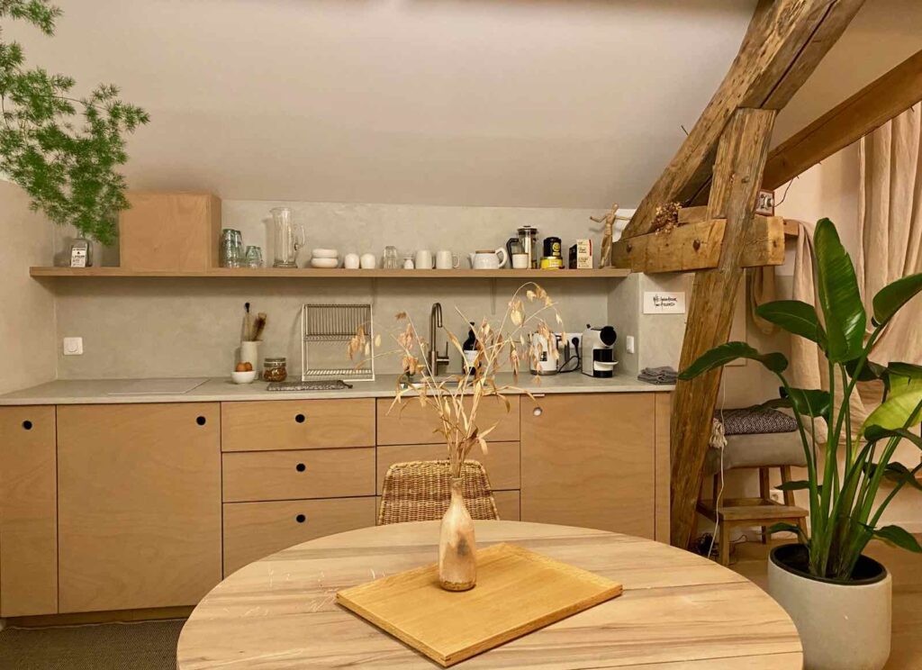 J’ai commencé par le coin cuisine tout équipé, ses meubles en bois clair et son inspiration scandinave bien dans l’esprit de L’Atelier.