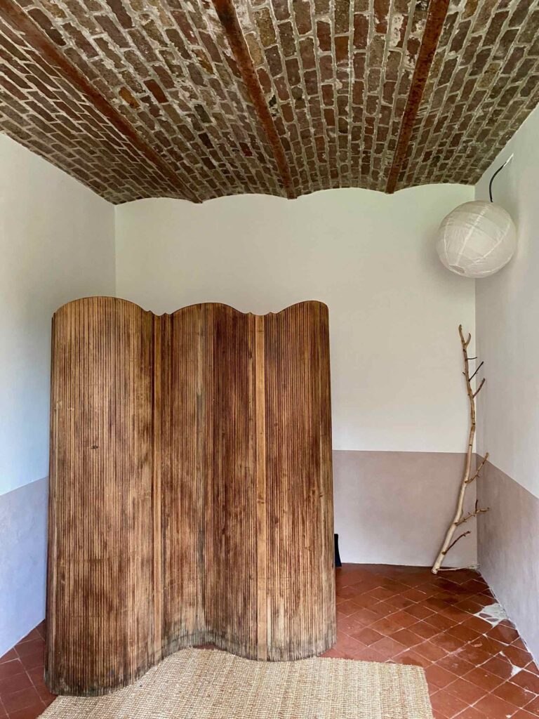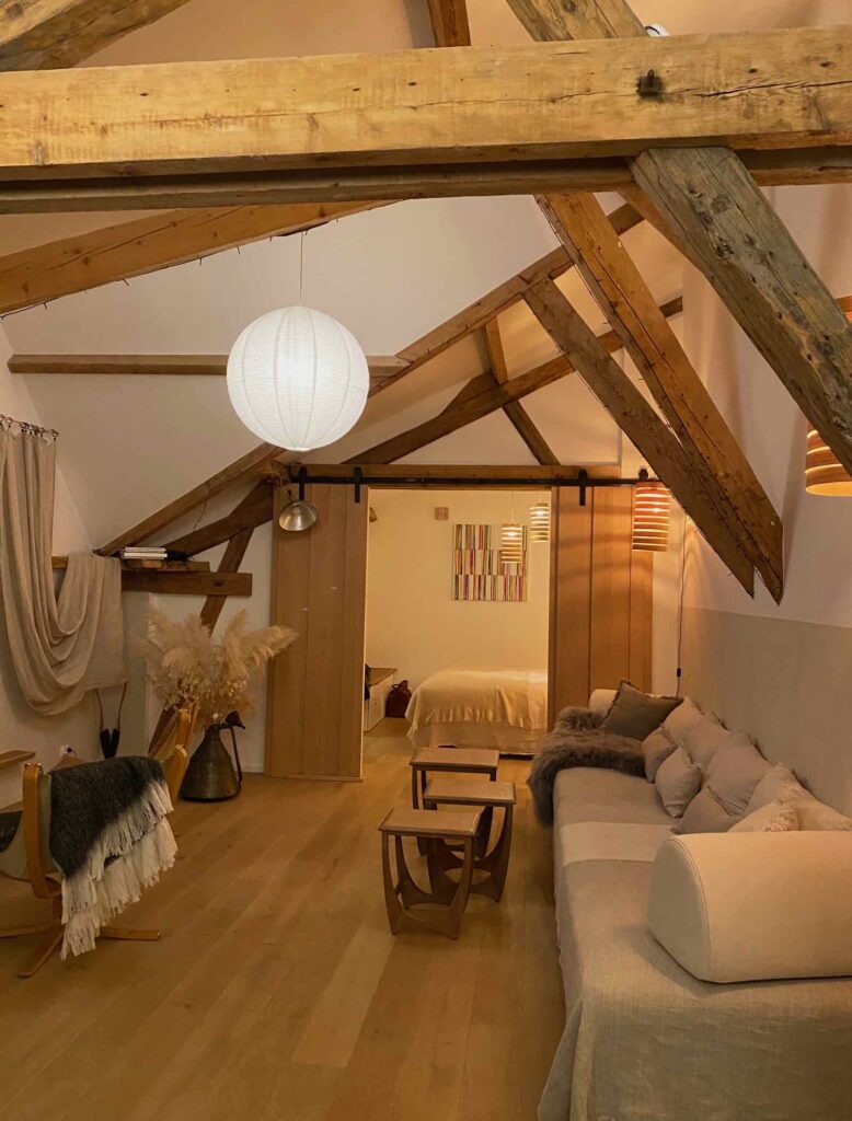 Quand elle a ouvert la porte de la dépendance, qui abritait autrefois les écuries, j’ai compris qu’elle m’avait réservé L’Atelier. Une entrée privée sous un plafond voûté en brique, un escalier qui grimpe et voici le superbe loft qui déroule ses 60 m2 sous mes yeux ébahis. J’avais rêvé quelques jours devant les photos sur le site mais là, en vrai, c’était encore autre chose…