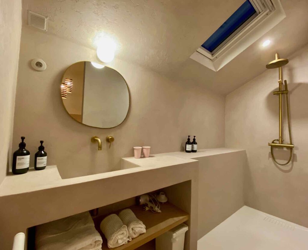 Quant à la salle de bain en béton ciré, très organique, elle dispose d’une grande douche à l’italienne et d’excellents produits de toilette Meraki.