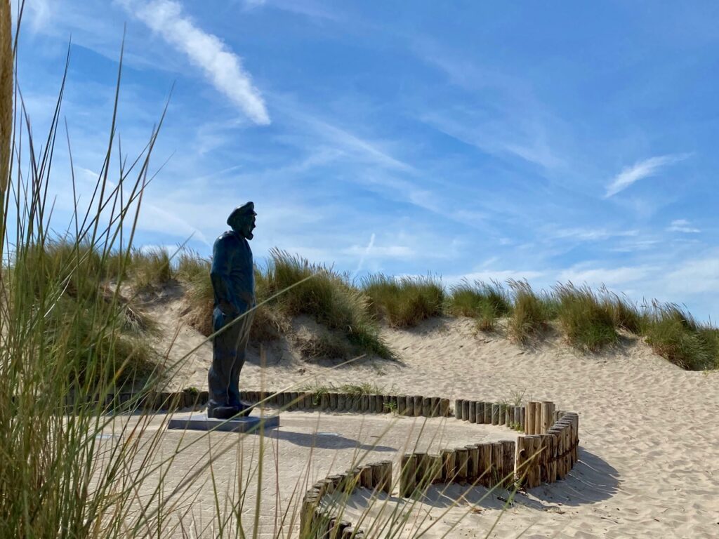 Petite avancée sur les planches du front de mer (fallait bien quitter le secteur) et premier arrêt pour saluer les deux personnages emblématiques de La Panne. Le pêcheur dans les dunes et le roi Léopold 1er, qui a carrément un monument sur la plage. Pile poil à l’endroit où il est arrivé, par la mer, à La Panne.