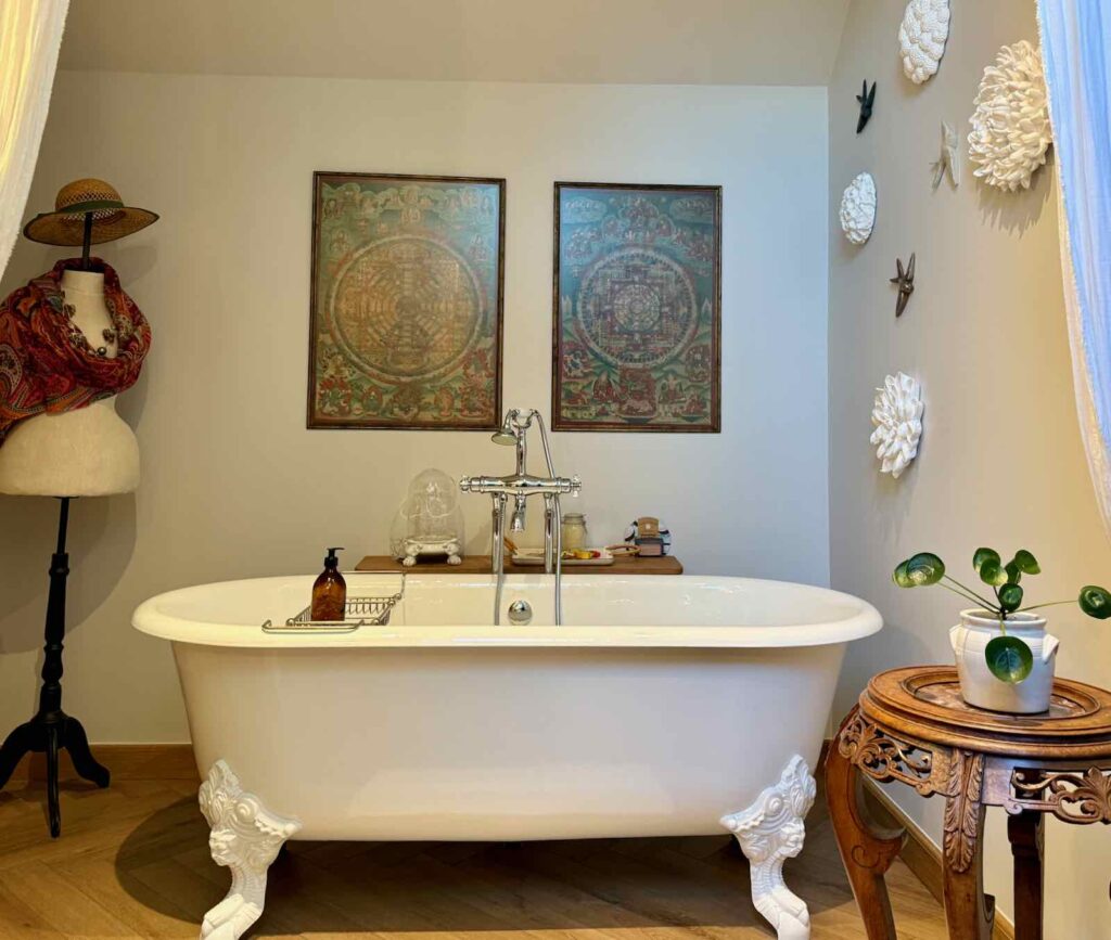 Elle, qui a tenu une maison d’hôtes dans la Marne pendant 20 ans, a mis tout son cœur à donner une couleur Belle Époque à La Petite Châtelaine. Des meubles et des objets de famille mais aussi des trouvailles faites chez les brocanteurs, ici ou ailleurs.