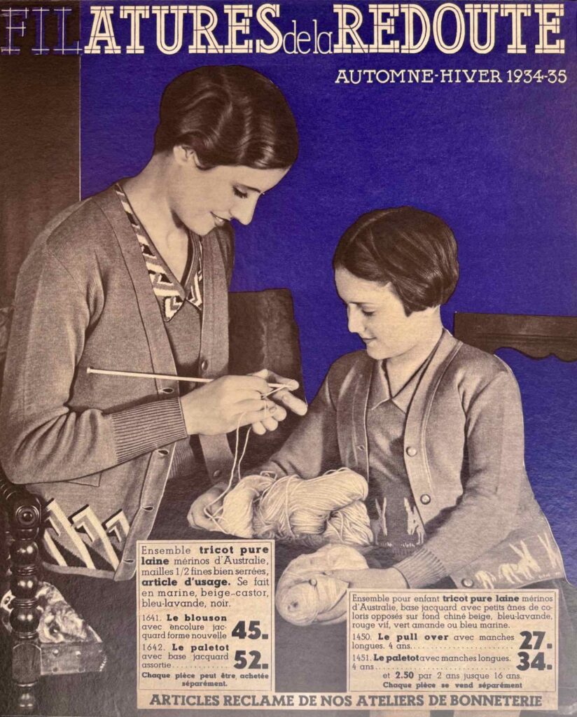 - Voilà l’une des toutes premières publicités pour les laines à tricoter des Filatures de la Redoute, dans les années 1924-1925.