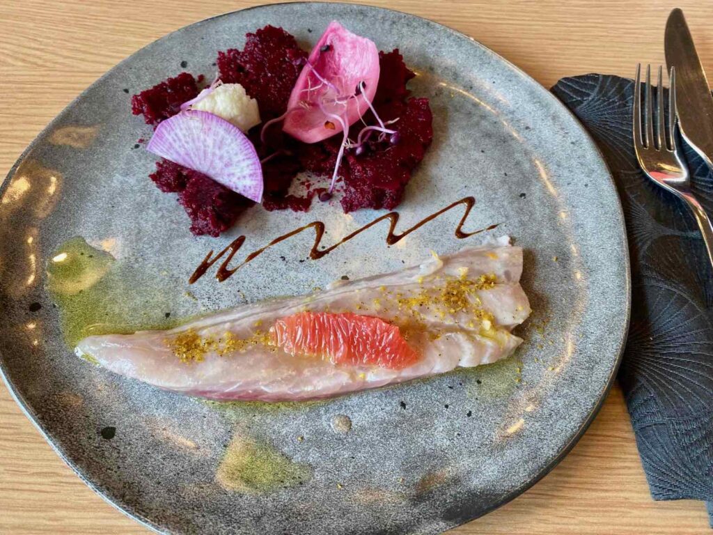 Le meilleur rapport qualité/prix est indéniablement offert par le menu à 36 €, choisi par mon voisin de table. Un filet de dorade au sel de Guérande et pamplemousse, ketchup de betterave crapaudine et pickles pour commencer.