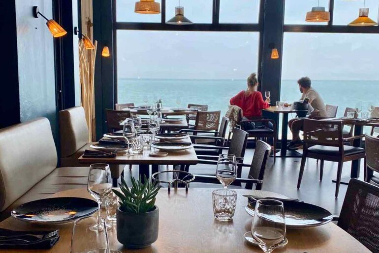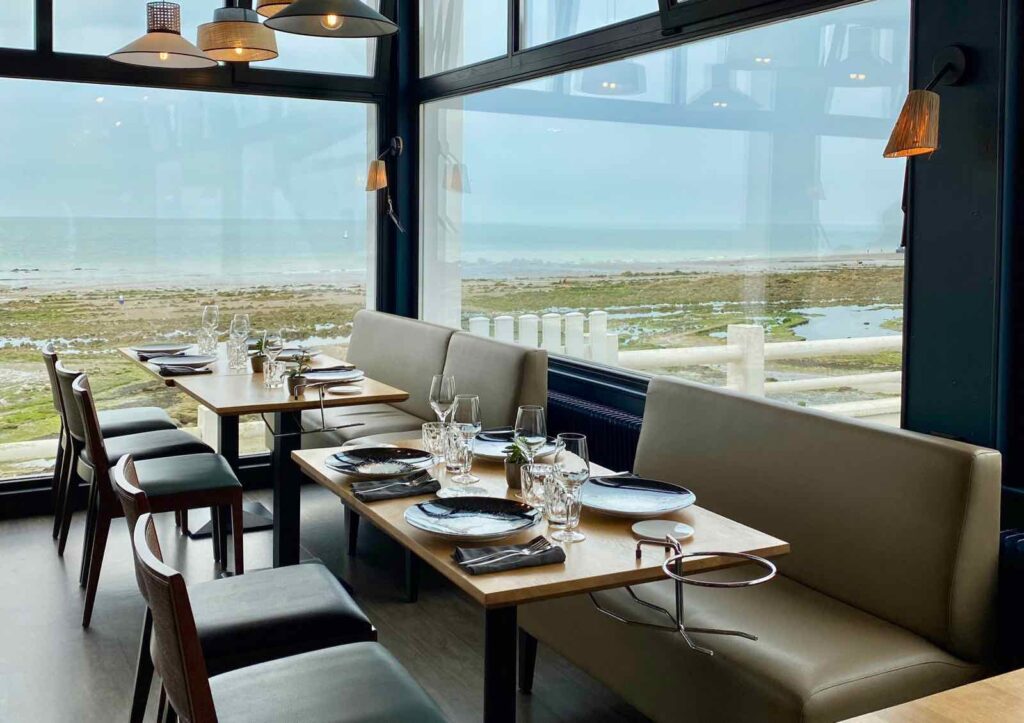 Du bleu (forcément), du noir, du bois naturel, de jolis luminaires, une vaisselle soignée, on se sent tout de suite bien dans les salles en front de mer, qui offrent une vue panoramique sur la Manche. Et aussi, quand le temps est dégagé, sur le cap Blanc-Nez, à une quinzaine de kilomètres de là.