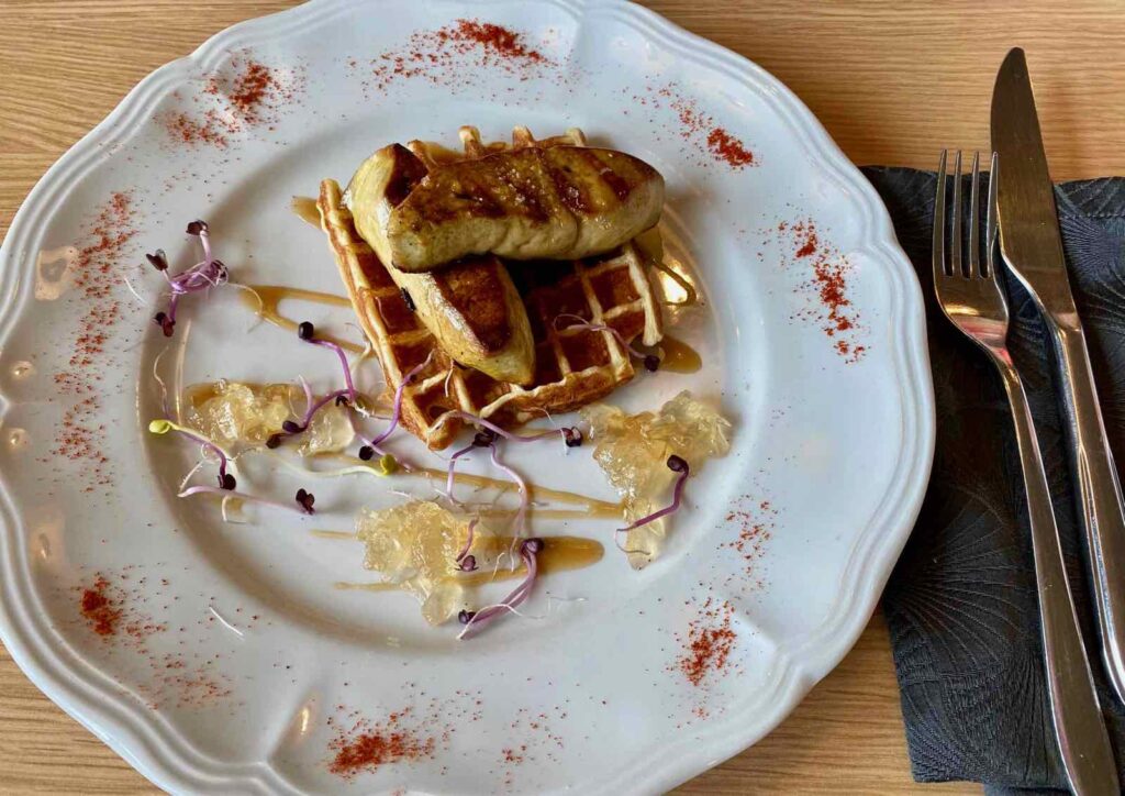 Mais tous ces délices de la mer ne m’ont pas tentée puisque j’ai pris, en entrée… une escalope de foie gras poêlée, gaufre et gelée à la bière blanche de Wissant. Foie gras, gaufre et bière, des mots magiques à mon oreille, qui m’ont fait saliver… et craquer.