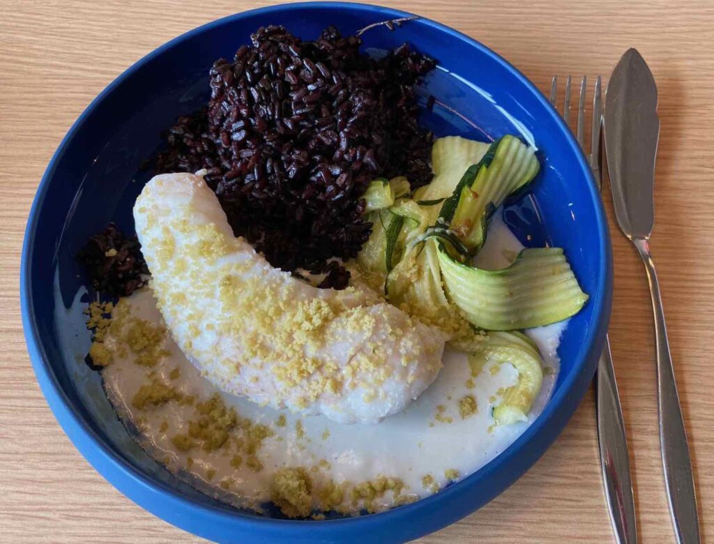 Retour au raisonnable après cela, avec un poisson en plat. Ouf. Un tronçon de lotte au lait de coco, gingembre et citron vert, une recette d’inspiration thaï exactement comme j’aime.