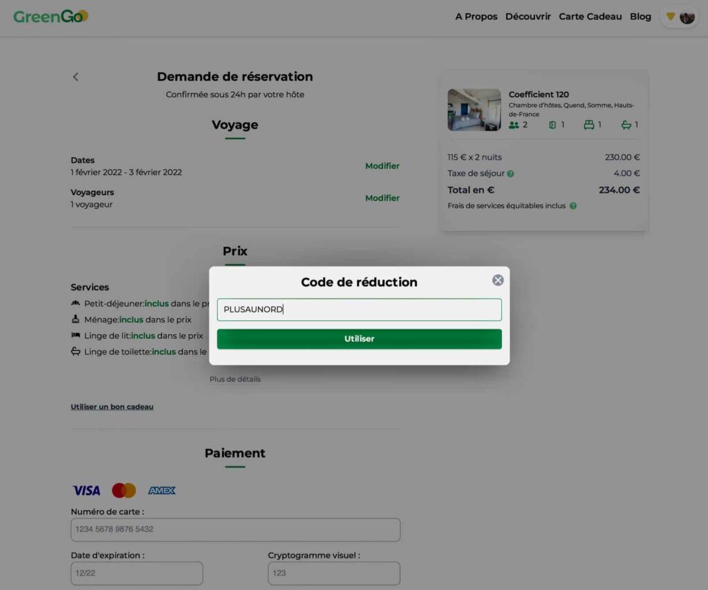 Au moment de réserver, juste avant de payer, cliquez sur « Utiliser un bon cadeau » et notez PLUSAUNORD dans la case « Saisir le code », avant de cliquer sur « Utiliser ».