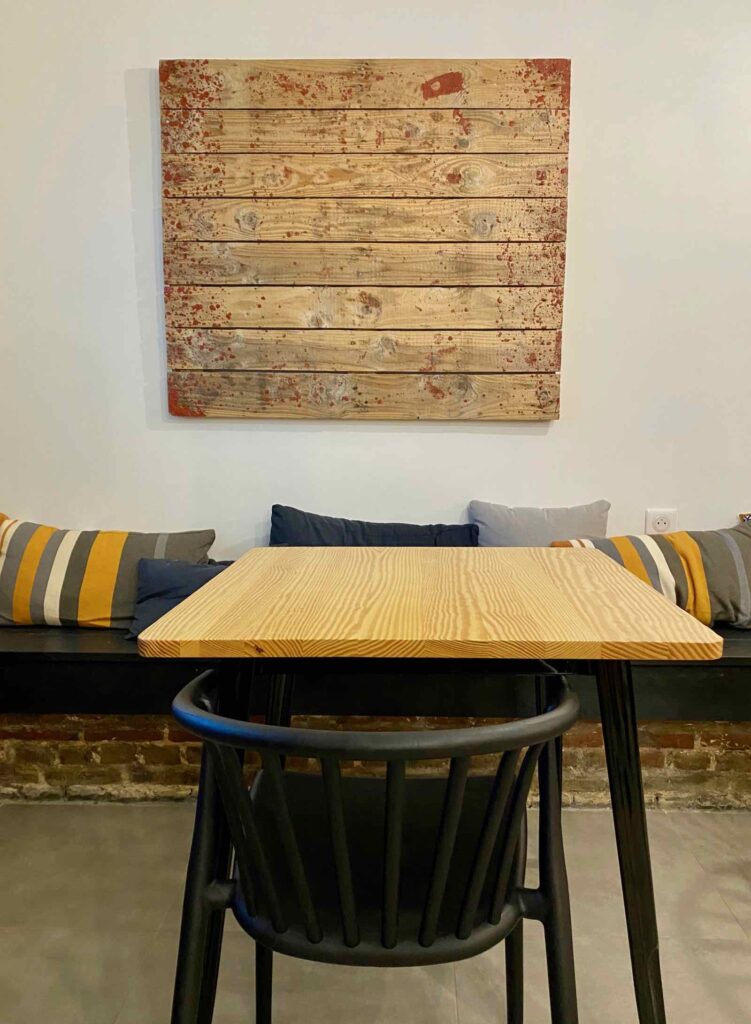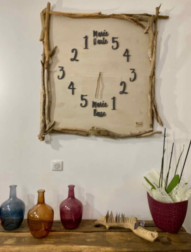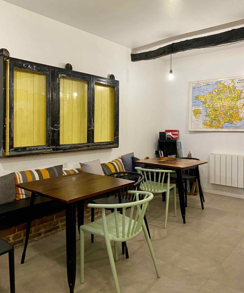 Le petit déj se prend dans une salle commune, où on note immédiatement le goût des propriétaires pour le recyclage. Récupérés, retapés et/ou détournés, meubles et objets vivent une nouvelle vie et font leur petit effet. Une ancienne carte de géographie (j’ai connu les mêmes… au siècle dernier), un vieux panneau syndical encore marqué CGT, une horloge en bois flotté, c’est du pur « upcycling » !