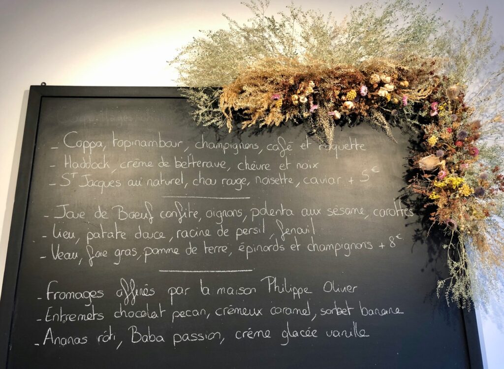 Menu à l’ardoise 27 € entrée/plat ou plat/dessert et 33 € entrée/plat/dessert.