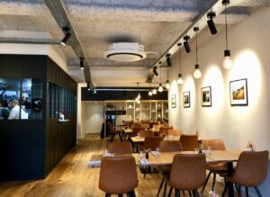 Nous voici donc attablées dans cette cantine contemporaine, sur le Grand Boulevard. Jolie déco un poil indus, avec une cuisine séparée par une verrière et pas mal de noir et de cuir, le tout réchauffé par beaucoup de bois. Joli emplacement aussi, dont le seul défaut est la difficulté de stationner pas trop loin, à l’heure du déjeuner. Mais bon, rien n’étant parfait sur cette terre, j’oublie vite le kilomètre que je viens de faire à pied pour mériter mon graal du jour…