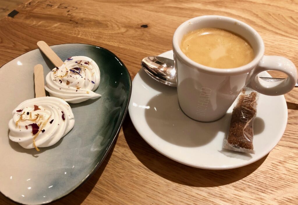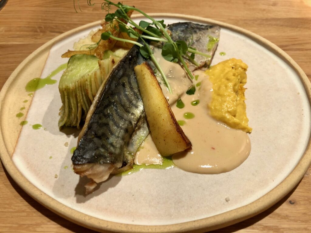 La gastronome qui m’accompagnait s’est quant à elle régalée du filet de maquereau, semoule à la cannelle, crème de maïs grillé, panais rôtis et réduction de crème de laurier, au menu du midi, ce jour-là. Une association originale et créative pour le coup, appréciée à sa juste valeur par Hélène, qui (contrairement à moi) apprécie le maquereau de nos côtes.