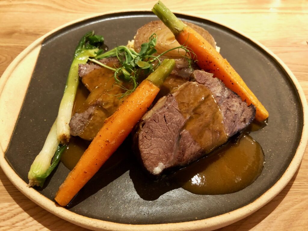 Pour continuer, j’ai pris la joue de bœuf confite, oignons, polenta au sésame, carottes. Un choix qui ne me ressemble pas trop mais qui, en ce sinistre jour de février, s’annonçait bien revigorant. Sans compter que la polenta au sésame me tentait diablement. Verdict, une joue méga super tendre, dans une sauce pleine de saveur. Pas tellement cuisine créative mais qu’importe.