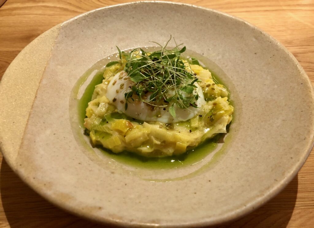 Ma co-goûteuse du jour s’est pour sa part contentée de la formule du midi (20 € entrée/plat, 25 € avec un dessert) avec, en entrée, une fondue de poireaux et son œuf parfait. Il n’y a pas que l’œuf qui était parfait, comme j’ai pu le vérifier en plongeant ma cuillère dans l’assiette voisine…
