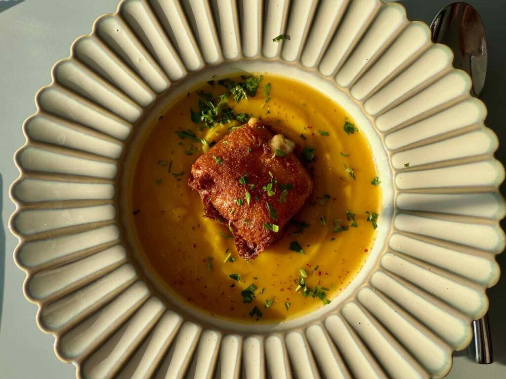 Perso, je me suis tournée vers la carte et j’ai préféré le velouté de potiron et son beignet de maroilles (13 €). En effet, si je ne suis pas très amatrice du roi de nos côtes, je suis dingue du fromage star de l’Avesnois. Le velouté était idéal par cette journée de grand froid et le beignet de fromage, croustillant à l’extérieur et fondant à l’intérieur, avait (presque) un goût de trop peu.