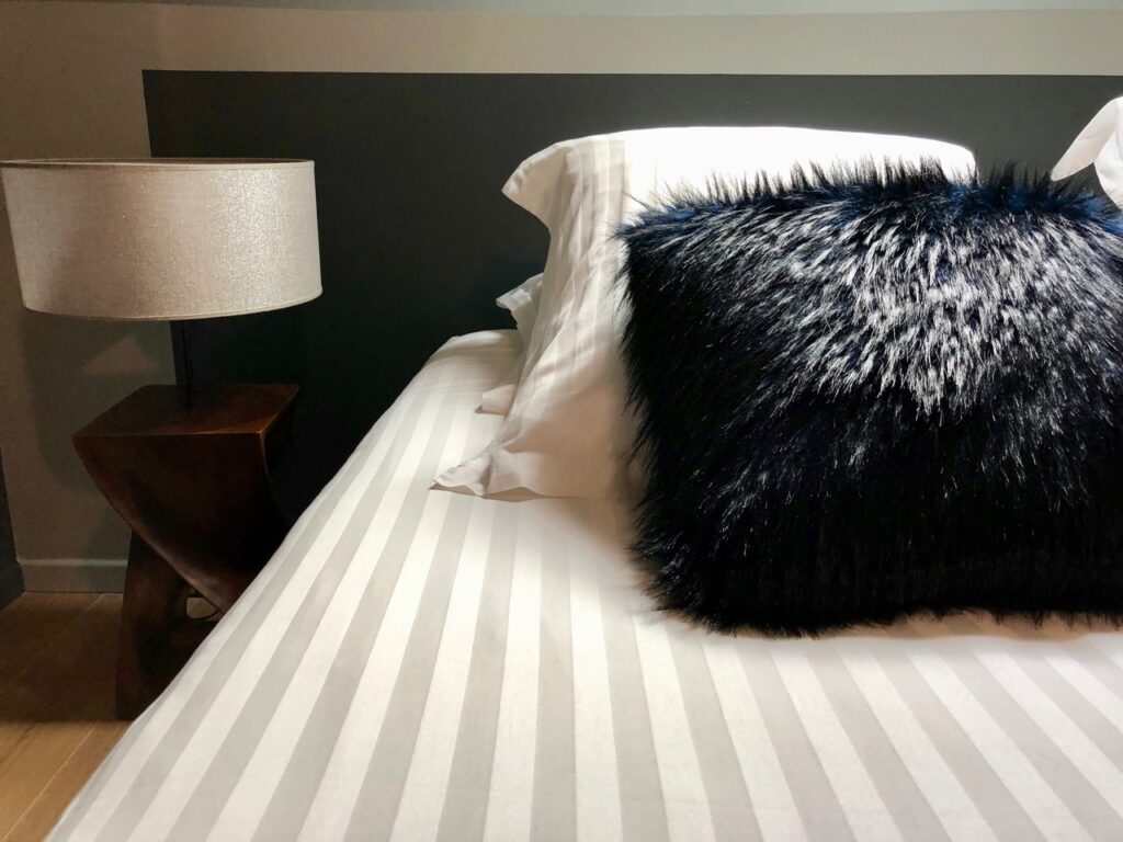 Derrière le salon, se cache une chambre noire et blanche, très cocooning, avec ses descentes de lit et ses coussins en (fausse, je vous rassure) fourrure.