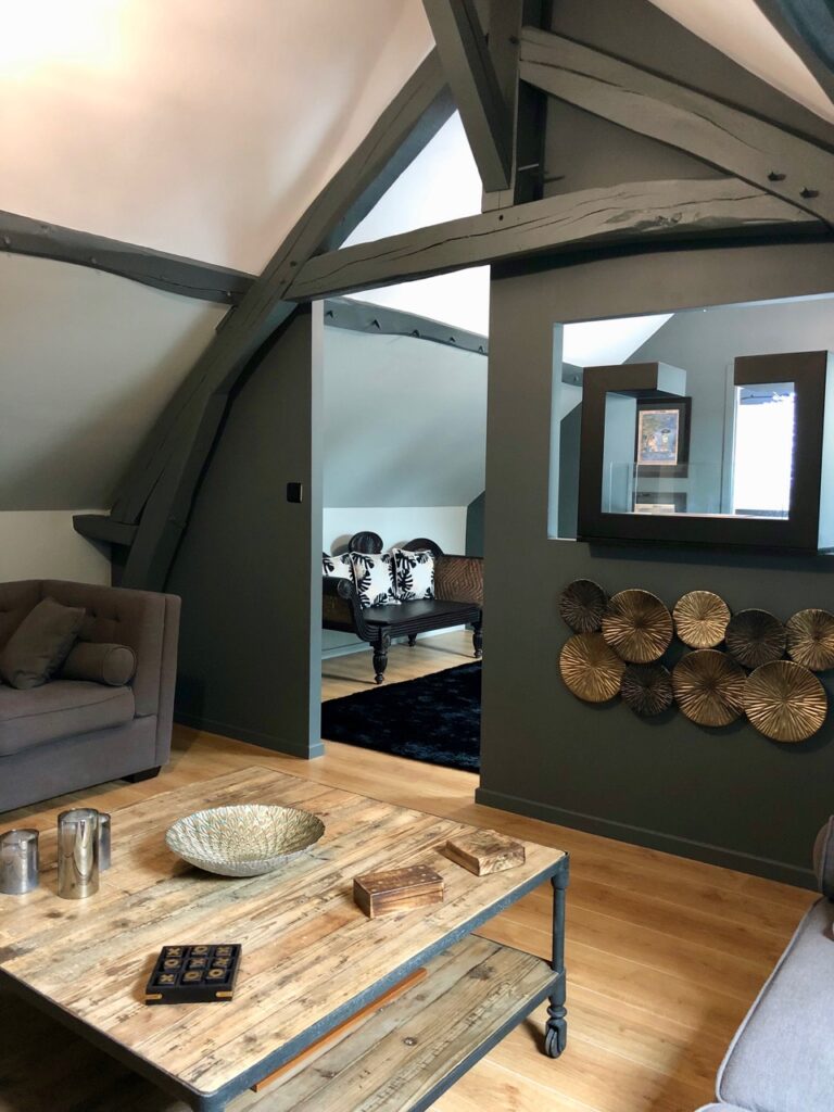 Pour ma part, j’ai logé dans Le Boudoir de Clémence, une suite de 50 m2 située sous les toits. Là comme ailleurs dans la maison, Sophie s’est éclatée à réaliser la déco et j’aime beaucoup ses choix, tant dans les couleurs que dans les meubles et objets.