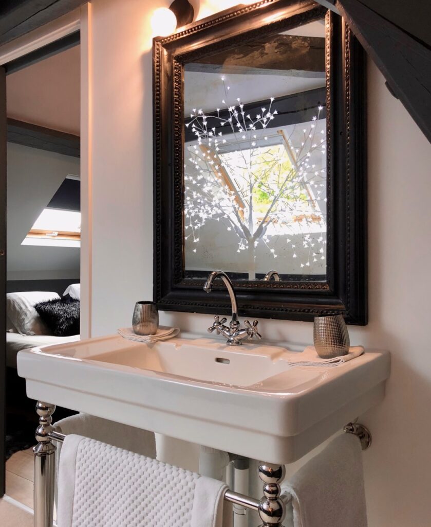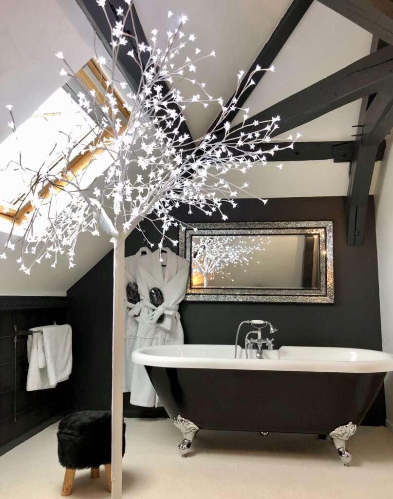 Tout au bout de l’étage, la grande salle de bain noire et blanche avec baignoire. Là aussi, Sophie s’est éclatée dans la déco et a soigné le moindre détail. L’arbre lumineux au milieu de la pièce d’eau…