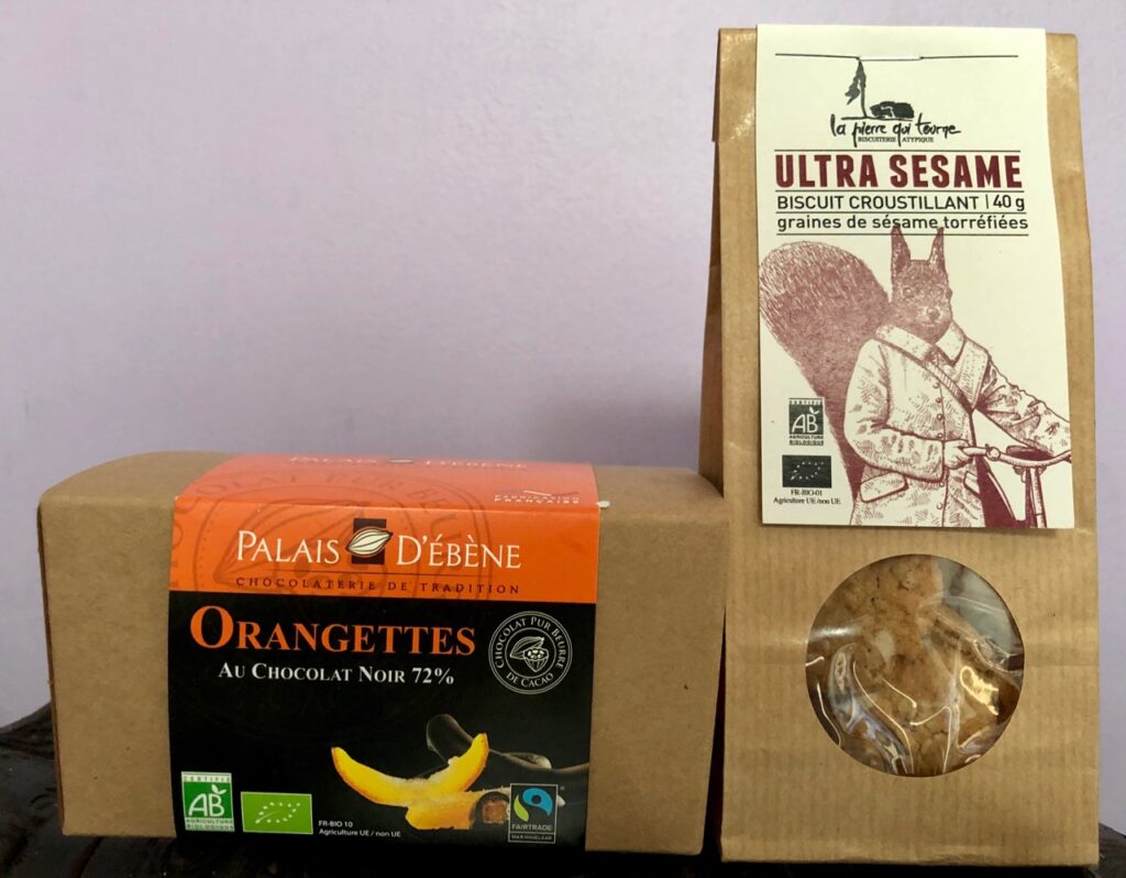 L’autre attention de Sophie, ce sont de petits cadeaux « made in Attichy ». Des orangettes au chocolat et des biscuits aux graines de sésame torréfiées (j’adore !), confectionnés par La Pierre qui tourne. Cette biscuiterie locale, artisanale et biologique, créée par deux artisans gourmands à l’univers décalé, propose des produits inattendus… et délicieux. Comme une invitation à revenir au Baptistère à Attichy…