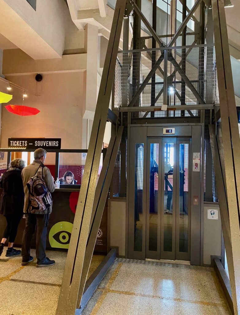 Au quatrième étage, voici l’espace billetterie et souvenir, juste à côté de l’ascenseur. Il vous conduira sans effort au sommet du beffroi de l’hôtel de ville de Lille, 6 étages plus haut. À moins que vous préfériez monter à pied pour admirer la structure de l’édifice. À savoir 3100 m3 de béton armé, 500 m3 de maçonnerie de briques et 300 tonnes d’armatures…