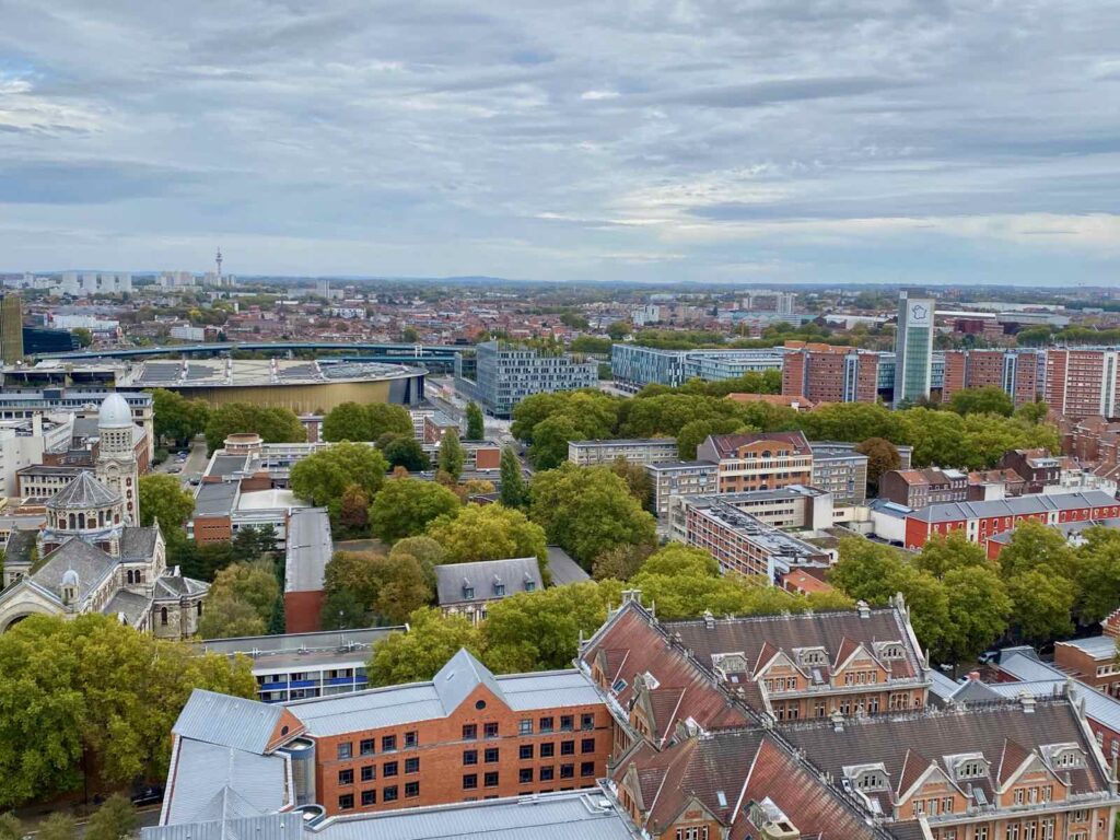 Au pied du beffroi de l’hôtel de ville de Lille, les immenses bâtiments de la mairie, ceux d’origine et ceux de l’extension. À gauche, l’église Saint-Sauveur de style néo-byzantin et le grand vaisseau ovale de Lille Grand-Palais.