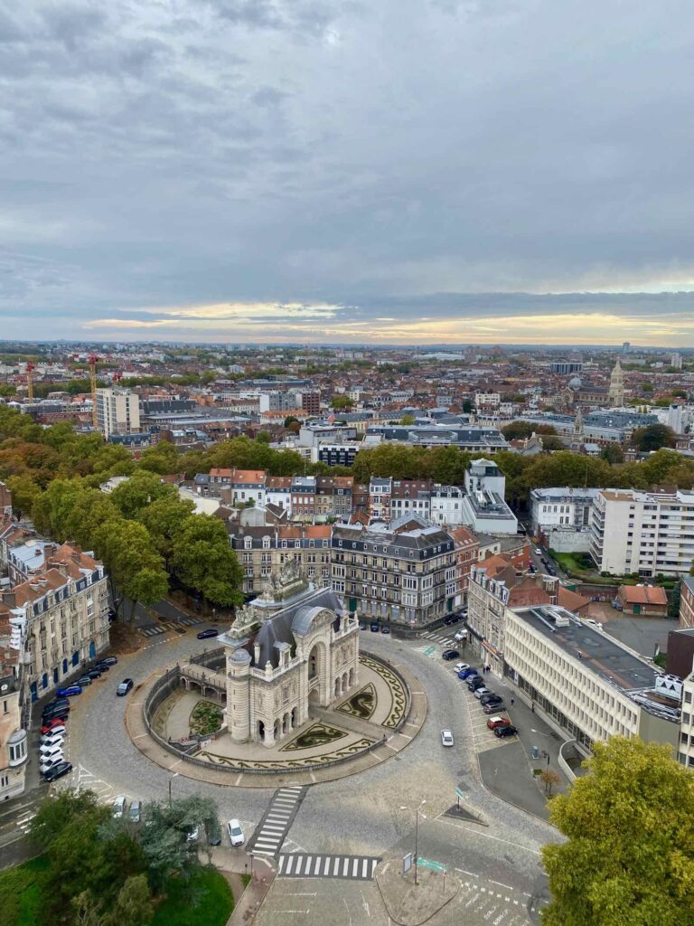 Avec mon amie Agnès, on est restées un bon moment là-haut à scruter les environs. À commencer par la place Simon Vollant, ornée de la somptueuse porte de Paris. Érigée à la fin du XVIIe, en forme d’arc de triomphe, elle célèbre la prise de Lille par Louis XIV en 1667. Rien n’est trop beau pour le Roi Soleil… Et, au sommet, deux anges armés de trompettes claironnent la (bonne ?) nouvelle au monde.