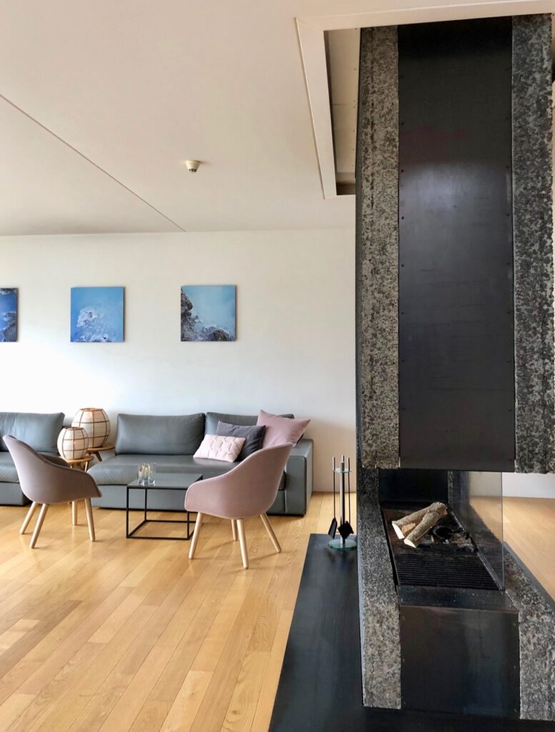 Dans les parties communes du Silica Hotel, c’est le même style contemporain qui règne en maître. Avec une cheminée et un coin salon pour le côté chaleureux…