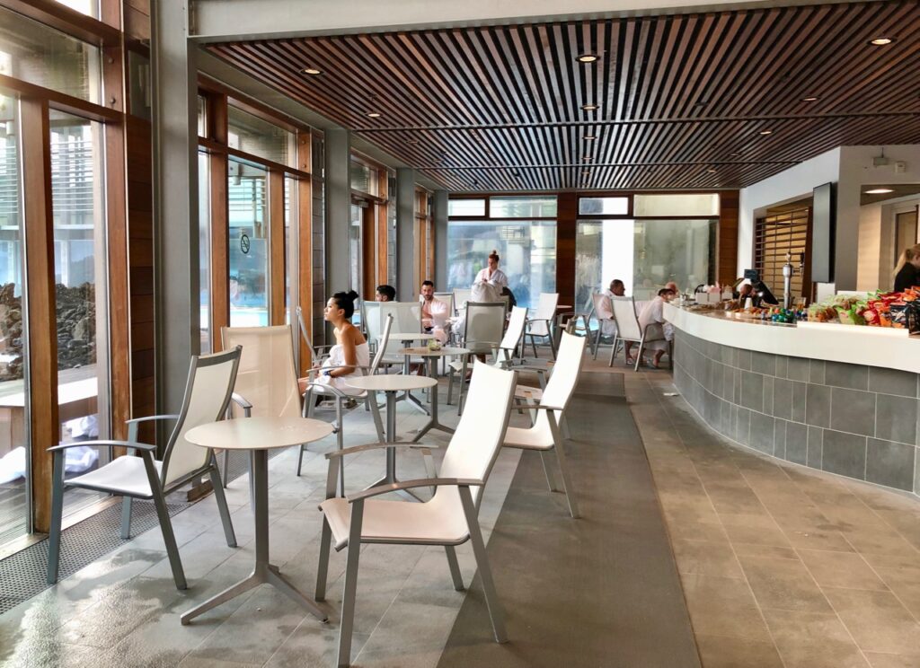 - Outre le (chic et cher) Lava Restaurant et le café situé à l’entrée (qu’on fréquente tout habillé), il y a une petite cafet où on ira chercher sa boisson gratuite, comprise dans l’entrée. On peut aussi y grignoter un morceau, si on reste la journée. Les panini, tortillas et autres salades sont autour de 2200 couronnes (soit environ 16 €).