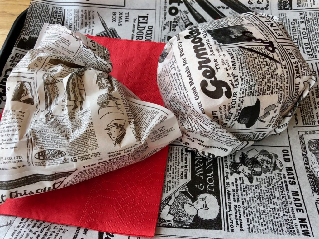Votre menu arrive donc sur un plateau dans du faux (ouf !) papier journal. Formule classique pour moi. Formule Big pour mes deux jeunes invités, avec deux steaks et deux tranches de cheddar dans le sandwich. Ils ont bon appétit Gabriel et Colas, 14 ans. Mais je crois bien qu’ils ont calé avant la fin…