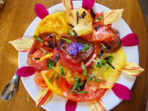 Jardin-des-ifs-gerberoy-restaurant-assiette-tomates-fleurs