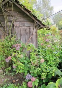 Jardin André van Beek Oise - cabanon et hydrangeas