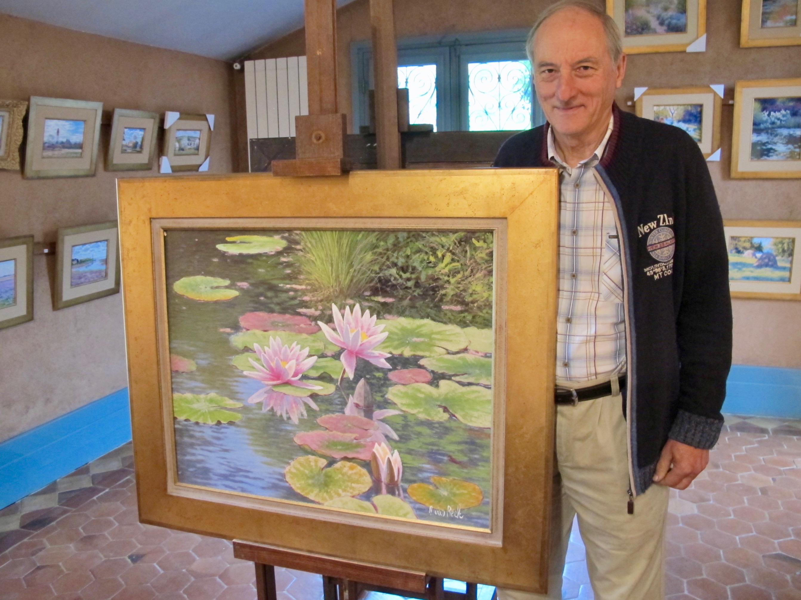 André van Beek dans sa galerie - avec tableau nénuphars