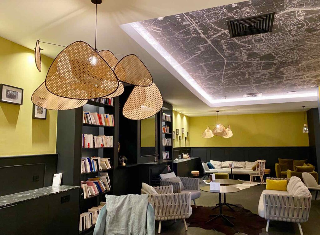 Je préfère vous le dire tout de suite. Vous n’allez pas le reconnaître ! L’établissement a fait peau neuve, profitant du fait que chaque Mercure a l’entière liberté de choisir son style de déco, comme sa restauration d’ailleurs. Ici, on a donc joué avec l’idée du Marque Page, dès l’entrée et le grand salon-bibliothèque, qui donne d’emblée d’excellentes vibrations au lieu.