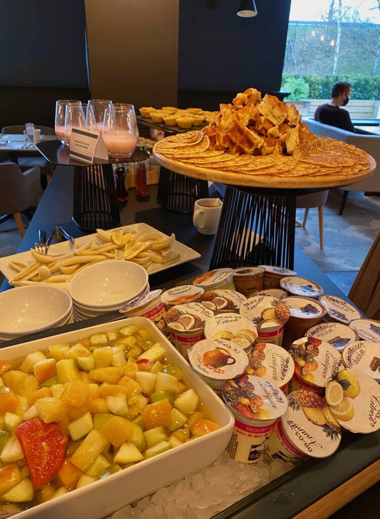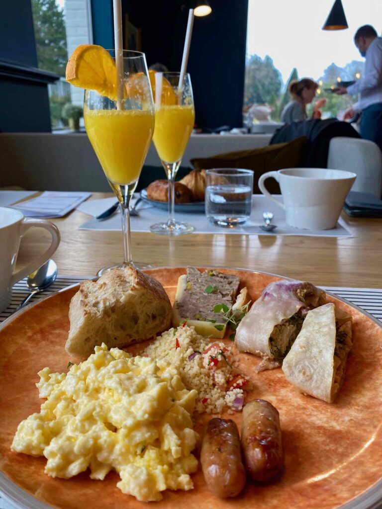 Et du temps à table, il en faut si on veut (presque) tout goûter du top brunch proposé par Le Marque Page Restaurant & Lounge Bar. Car ce brunch, c’est tout sauf un petit déjeuner amélioré. Servi à partir de midi, il est en effet plus proche du lunch que du breakfast, avec ses entrées, ses plats chauds, son plateau de fromages et ses desserts… Mon ami Thierry a commencé par une assiette de petit déj. Là où moi je m’attaquais direct aux œufs/saucisses et aux entrées, dont d’excellents tacos de poulet.