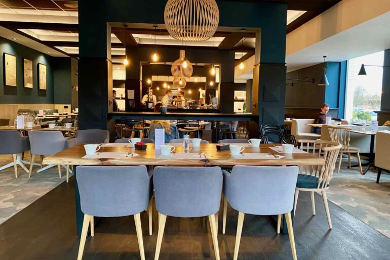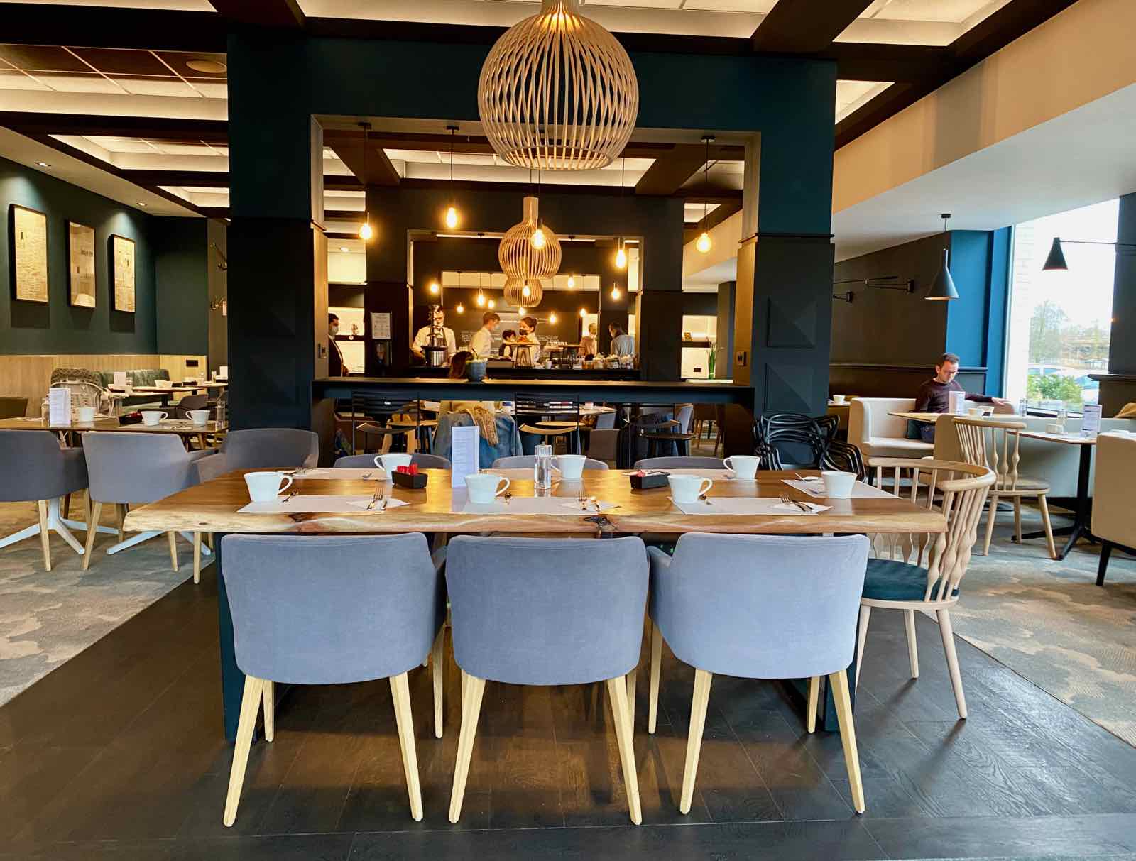 Et puisqu’on en est à parler déco, jetons tout de suite un œil à celle du Marque Page Restaurant & Lounge Bar. On y trouve la même gamme de couleurs que côté salon, les mêmes matières douillettes, beaucoup de lumière grâce à de grandes baies vitrées et aussi beaucoup d’espace entre les tables.