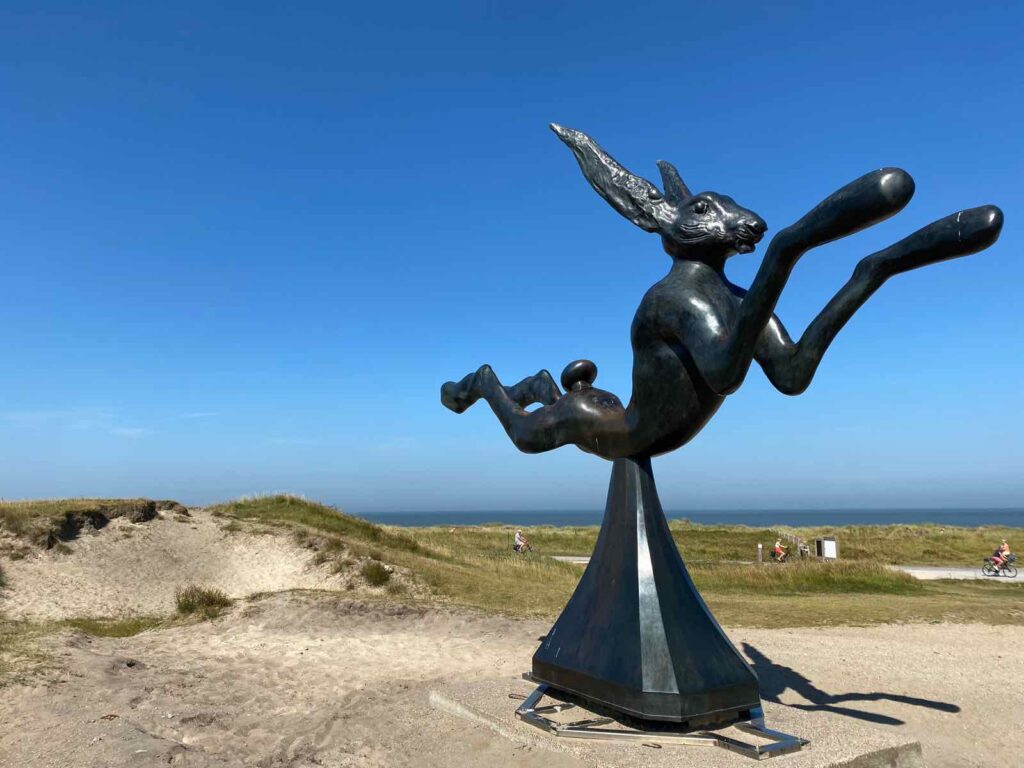 Ce lièvre bondissant, qu’on croirait échappé d’Alice au Pays des Merveilles, se mérite ! Pour le découvrir, il faudra en effet faire un peu de marche (une demi-heure ? Plus ?) et rejoindre les dunes, tout au bout de la digue, en direction du Zwin. À l’opposé exact de l’arrêt de tram Station.