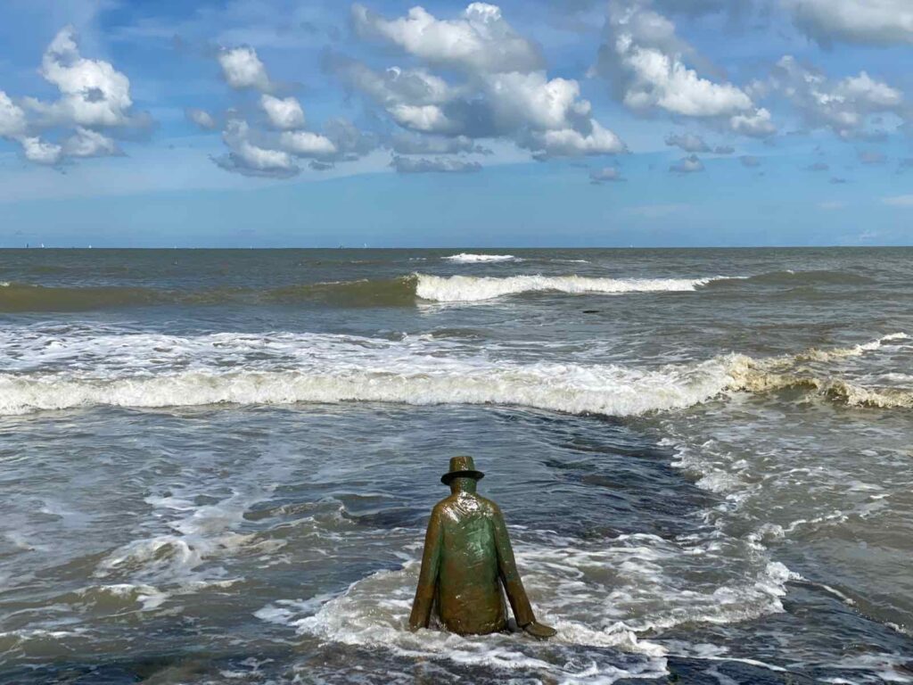 Il faudra marcher un peu plus longtemps, un petit quart d’heure environ, pour arriver à cette œuvre, ma préférée à Knokke. Ce petit bonhomme, vêtu d’un imperméable et d’un chapeau, est inspiré à la fois par Magritte et par l’inspecteur Maigret de Georges Simenon, un autre Belge célèbre. Aujourd’hui installé sur un brise-lames, à hauteur de Paul Parmentierlaan, il est submergé à chaque fois que la marée monte. Autant ne pas lutter contre La Mer, ce grand sculpteur…