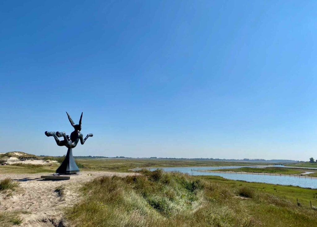Barry Flanagan avait déjà posé son animal fétiche sur Park Avenue à New York ou au Grant Park à Chicago. Le voici à deux pas du Zwin, dans un environnement de dunes, de verdure et d’eau. Celui qu’on surnomme Bugs Bunny a l’air de voler dans le ciel azur, invitant le promeneur à prendre son envol à sa suite.
