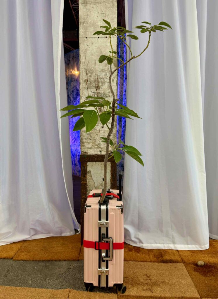 Un avocatier dans une valise, comme une œuvre végétale évolutive et poétique. Mais à la fin, n’est-ce pas toujours la plante qui gagne, la nature trouvant à tous les coups le moyen de s’échapper, quel que soit le carcan qui l’emprisonne. Un peu comme l’art, non ?