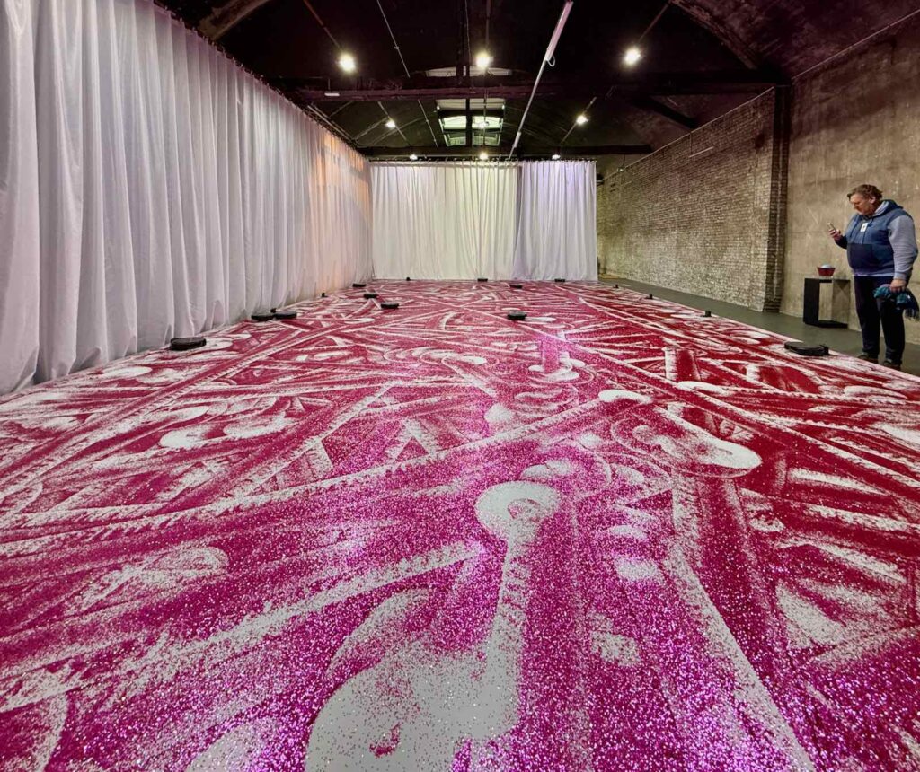 Une petite vingtaine de robots aspirent puis recrachent des paillettes fuchsia, créant ainsi les motifs d’un gigantesque tableau, qui change à chaque seconde.