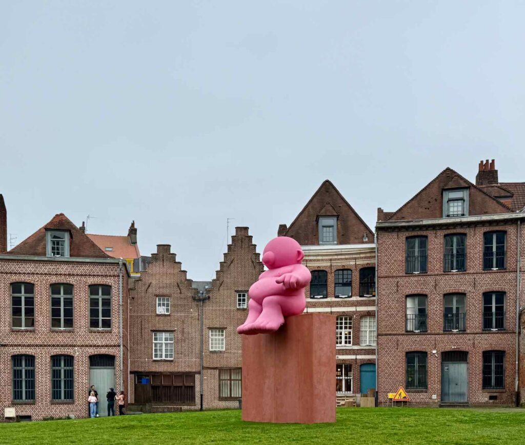 À cette septième place de mes œuvres préférées de lille3000, j’aurais pu mettre l’installation de Philippe Katerine sur la façade de « La Voix du Nord » (bâtiment où j’ai quand même passé 17 ans de ma vie !). Mais j’ai préféré choisir le spot de l’Îlot Comtesse, dans le Vieux-Lille, où l’artiste un brin déjanté a également installé un Monsieur Rose. Comme ses congénères de la Grand Place, celui-ci s’inscrit dans le courant du mignonisme, né de l’imagination débridée de Philippe Katerine. Monsieur Rose, c’est sa créature, sa chose, qui invite à chercher la beauté cachée des petits riens du quotidien. Rondouillard et tout rose, Monsieur Rose est devenu un emblème de bienveillance et d’optimisme. Et dans la furie de ce monde, ça fait drôlement du bien ! Sans compter qu’ici, à l’Îlot Comtesse, il tranche radicalement avec les belles façades flamandes, les mettant un peu plus encore en valeur.
