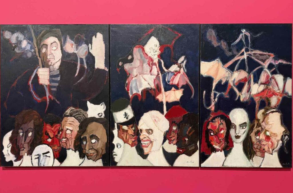 Mais ici, c’est plutôt le carnaval de Dunkerque que le peintre du Groupe de Roubaix a revisité. Sans parapluies colorés et boas fluo. Mais avec des visages inquiétants et des couleurs rouge sang. Comme l’envers d’un décor joyeux et festif.