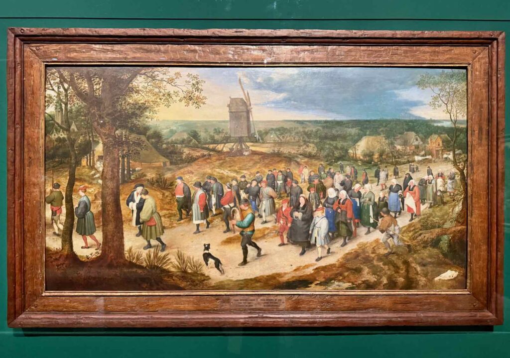 Cette scène du cortège de noces pourrait bien se passer dans un village brabançon, près de Bruxelles. Comme le voulait la coutume, la mariée est en noir, les époux portent une couronne, tandis qu’hommes et femmes avancent chacun de leur côté.