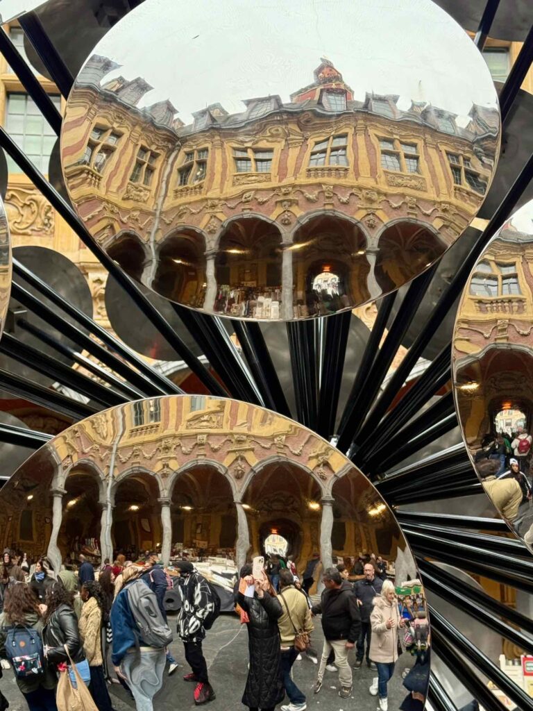Sorte d’ovni posé au milieu du site patrimonial de la Vieille Bourse, Orb ne jure pourtant en rien ici. Mieux, il sublime la beauté de ce bâtiment du XVIIe et démultiplie ses guirlandes et ses ornements grâce à son côté boule à facettes. Magique !