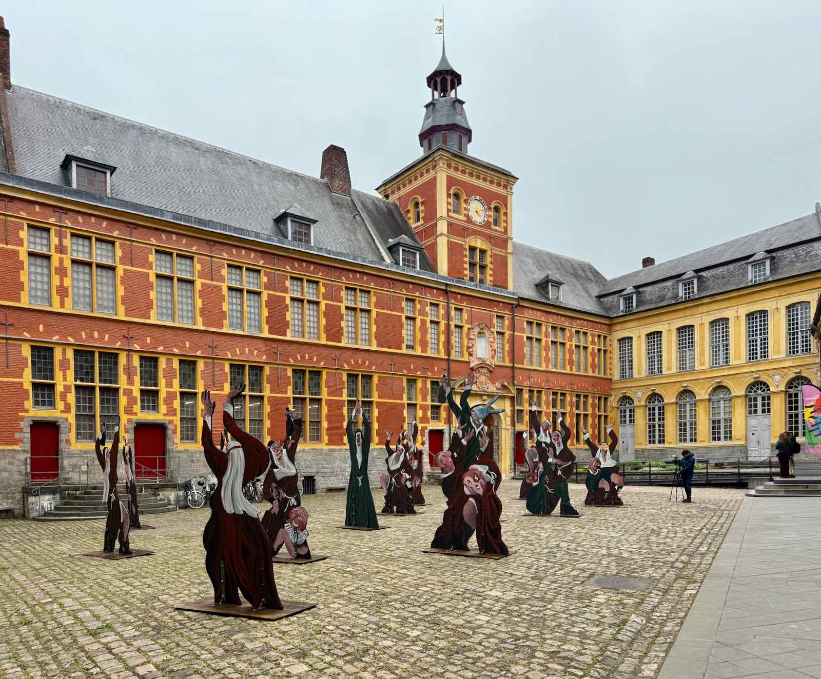 On entre dans la cour de l’Hospice Comtesse et, bim, on s’arrête net. Mais quels sont ces personnages surréalistes qui occupent tout l’espace ? Quels sont ces masques grotesques qui nous narguent, tout en continuant leurs (sales) petites affaires ?