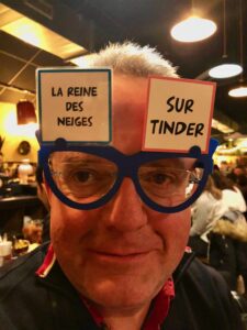Suivi d’un Mikado géant, avant une partie de « Ta mère en slip ». Ce jeu, sorte de « Cadavre exquis » en beaucoup moins érudit (pas intello du tout d’ailleurs…), a encore fait monter l’ambiance d’un cran. Le principe ? Chacun enfile une paire de lunettes ridicule, surmontée de deux cartons. L’un avec un personnage ou une personne, l’autre un lieu ou une action. À chacun de deviner les siens, par une série de questions aux autres joueurs. Forcément le « Tinder » et le « Speed dating », jamais devinés, ont donné lieu à quelques jolis quiproquos !